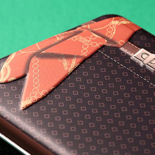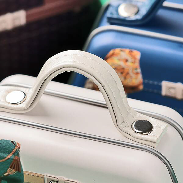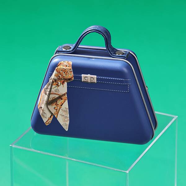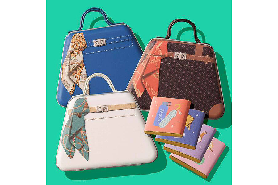 ハンドバッグ風にデザインしたミニチュア缶にチョコレートが4枚入っており、価格は698円。商品サイズは約85×65×28mm、カラーはブラウン、ホワイト、ブルーの3種類を用意している。