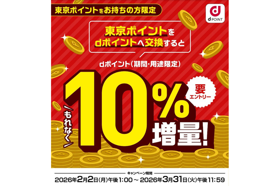 ちなみに「d払い」のNTTドコモでは、「東京ポイントからdポイントへの交換で+10%もらえるキャンペーン」を2月2日13時~3月31日23時59分の期間実施する。