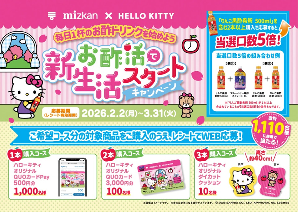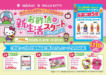 Mizkan(ミツカン)は、ハローキティとのコラボレーション企画第2弾となる「お酢活で新生活スタートキャンペーン」を開始した。