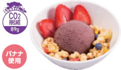 環境に優しくおいしいスイーツを届けるため、アグロフォレストリー栽培(森をつくる農業)による原料使用で2002年の創業以来、累計6万3000トンのCO2削減見込みの「フルッタフルッタ」製の最高濃度の「アサイー」を使用している。