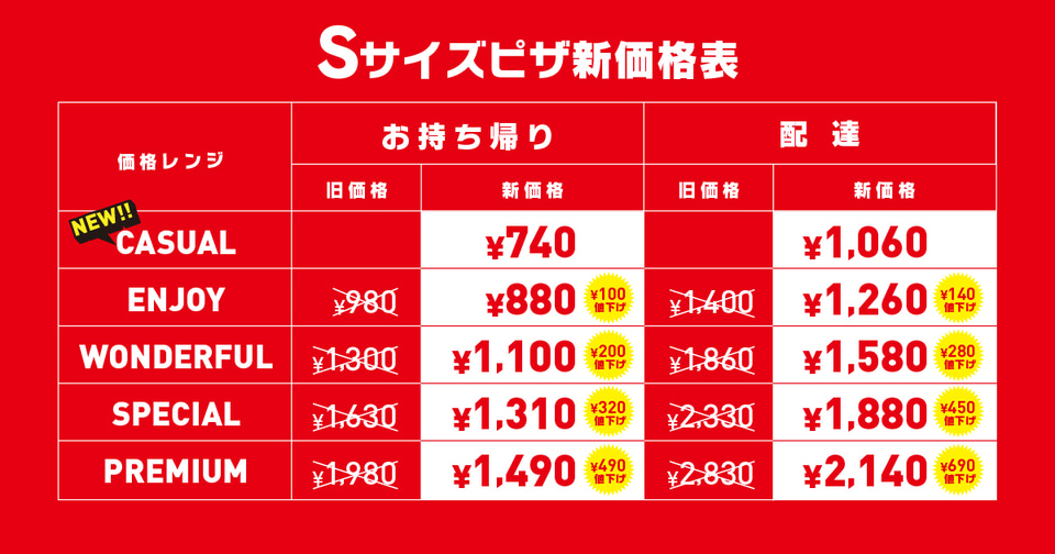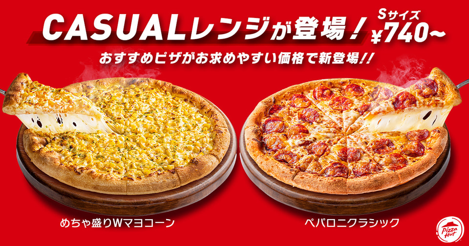 ピザハット(日本ピザハット)は、価格を改定しSサイズピザを全商品値下げするとともに、最安値価格レンジ「CASUAL(カジュアル)」を導入する。