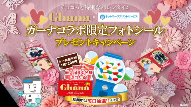 同社のマルチコピー機では、「ネットワークプリントサービス」を使ってフォトシールの印刷(L判・200円)が可能。今回のキャンペーンでは、ロッテ「ガーナ」とコラボした限定フレーム付きフォトシールを用意した。また、ネットワークプリントLINE公式アカウントから抽選に参加すると、当選者にはフォトシールが無料になるクーポンが配布される。
