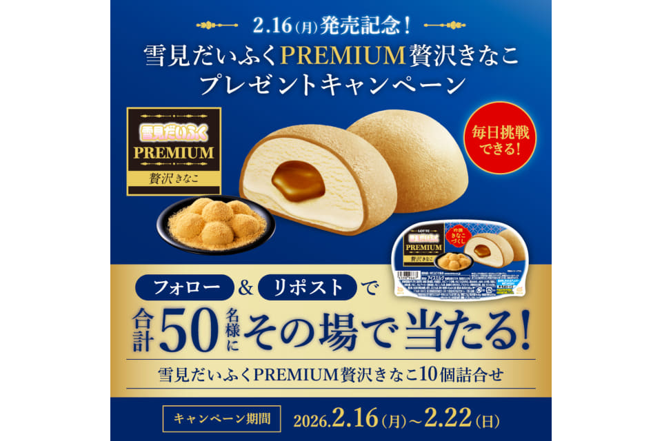 発売に合わせて、公式Xアカウントでプレゼントキャンペーンを実施する。応募期間は2月16日12時~22日で、抽選で計50名に「雪見だいふくPREMIUM贅沢きなこ」10個が当たる。雪見だいふく公式Xアカウント(@yukimi_lotte)のフォローと対象投稿のリポストをすることで参加できる。