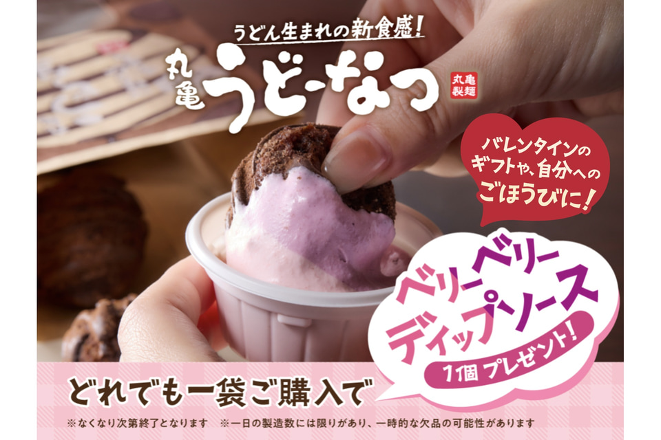 バレンタインシーズンに合わせたもので、「濃厚ダブルチョコ ごほうびチョコ味/しあわせミルク味」「きなこ味/きび糖味」が対象となる。また、「丸亀うどーなつ」を購入すると、特製の「ベリーベリーディップソース」を3月2日まで無料で提供する。