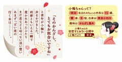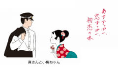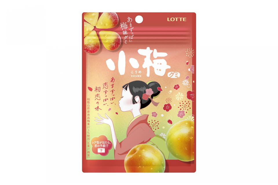 「小梅グミ」は、小梅ちゃんが慕う真(まこと)さんとの淡い恋のゆくえを予感させる春一番に、ひらひらと舞う梅の花びらをイメージした、和歌山県産南高梅使用の初恋を思わせるあまずっぱくフルーティーなグミ。赤と黄色の花びら型で、並べると一輪の梅の花を作れるほか、手紙のレアな形のグミもある。パッケージは、手に取る度にきゅんと気分が上がる、春一番に吹かれる恋する小梅ちゃんが着物の色違いで全3種類描かれている。