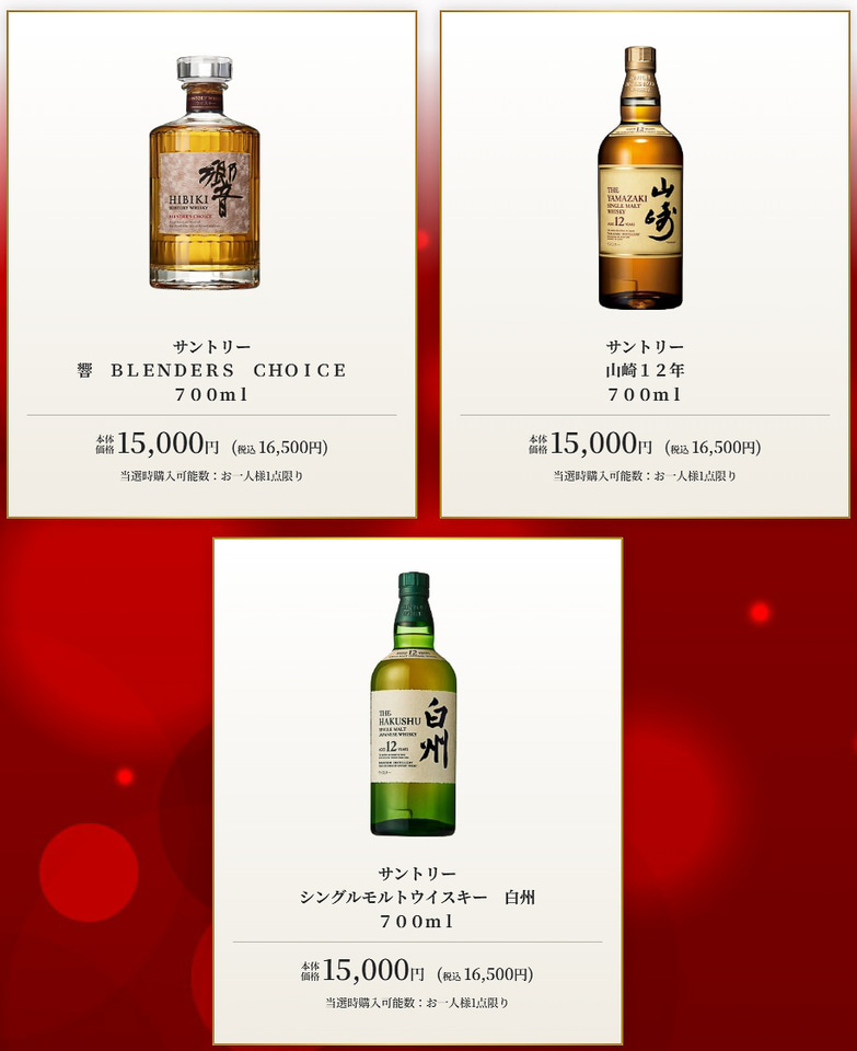 サントリーの「シングルモルトウイスキー山崎12年」「シングルモルトウイスキー白州12年」をメーカー希望小売価格で購入できるチャンスとなっている。