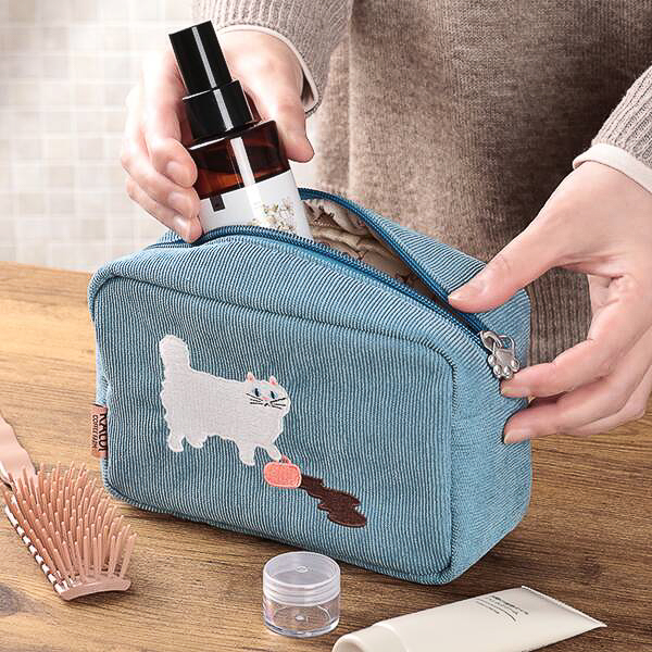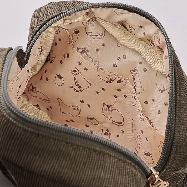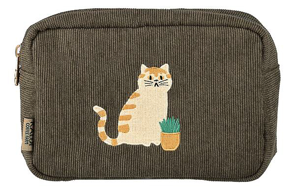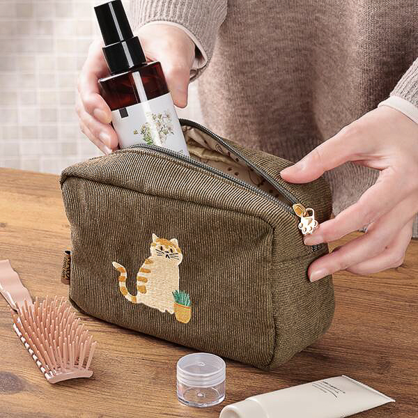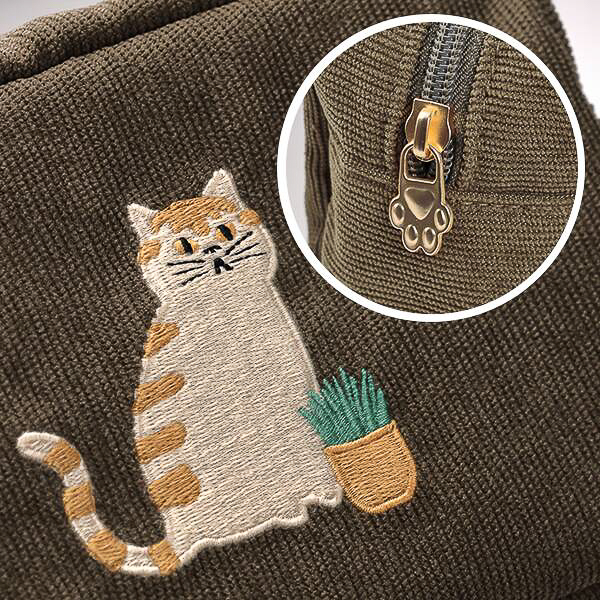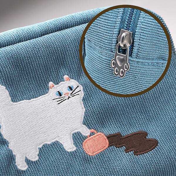 温かみのある手触りのコーデュロイのポーチで、かわいいネコの刺繍と、ファスナーの肉球型の引き手がデザインのポイント。ポーチの内側もかわいいネコの総柄になっている。サイズは約180×75×120mm(幅×奥行き×高さ)、「白ネコ」と「茶トラ」の2種類を用意している。