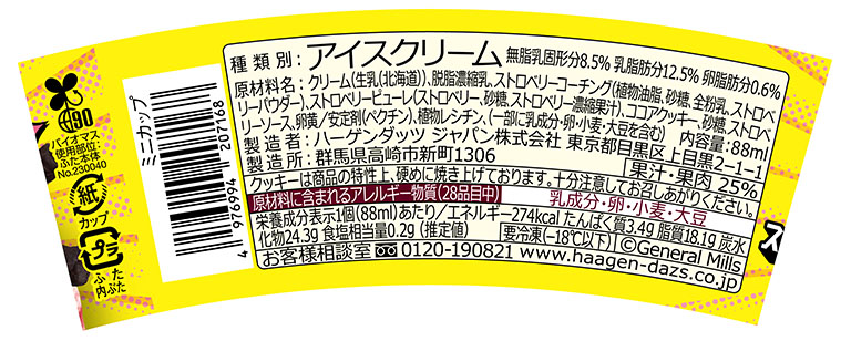 「ストロベリーブラックココア」は、果実感のあるストロベリーソースを加えた、クリーミーなストロベリーアイスクリームに、ほろ苦さがアクセントの、岩のようにごろっとした“ザク硬”食感のハードブラックココアクッキーをトッピングした。アイスクリームとココアクッキーの食感の対比に、ストロベリーの甘酸っぱさが重なり、ついつい食べ進めたくなる。内容量は88mL。