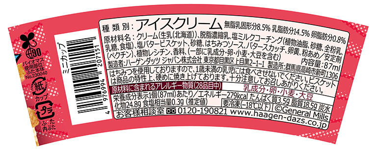 「ソルティハニーバター」は、バターのコクとハニーソースの優しい甘さが広がる、なめらかなバタースカッチアイスクリームに、ほどよい塩味の、岩のようにごろっとしたハードバタービスケットをトッピングした。アイスクリームとビスケットの食感の対比に、ハニーバターの甘じょっぱさが重なり、ついつい食べ進めたくなる。内容量は87mL。