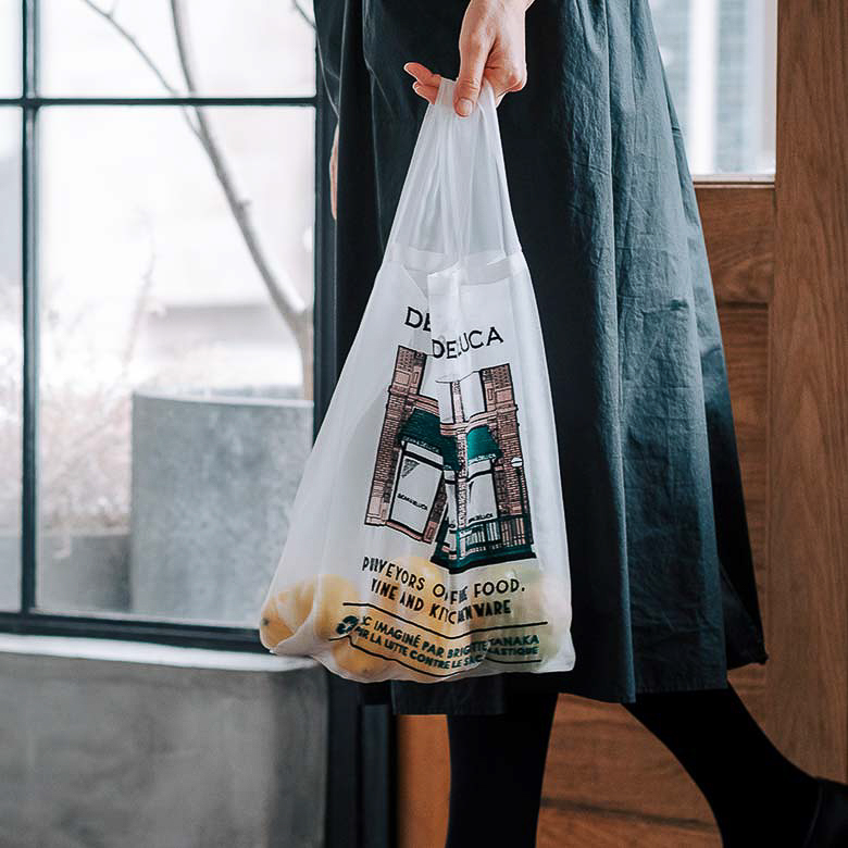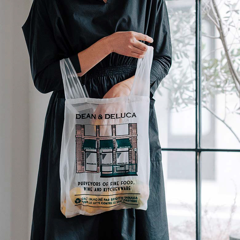 Brigitte Tanakaのシグネチャーであるオーガンジーバッグに、DEAN & DELUCA のルーツである「ニューヨーク ソーホーの店舗」をデザインした「SOHO」と、ブランドのルーツ「地中海食材」をテーマにデザインした「FOOD」の2種を用意している。