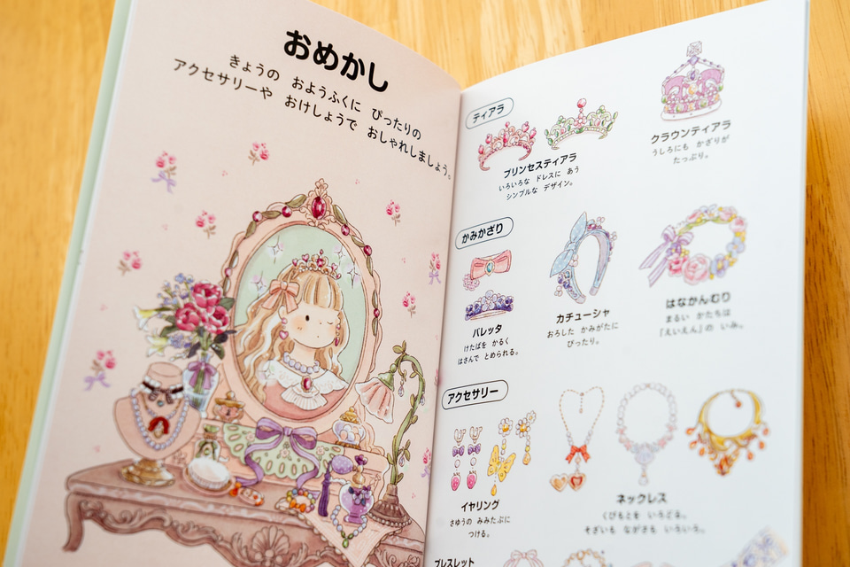 アクセサリーや化粧品、帽子などおひめさま必須グッズも紹介されていて、お姫様の世界を楽しく学べる一冊となっている。