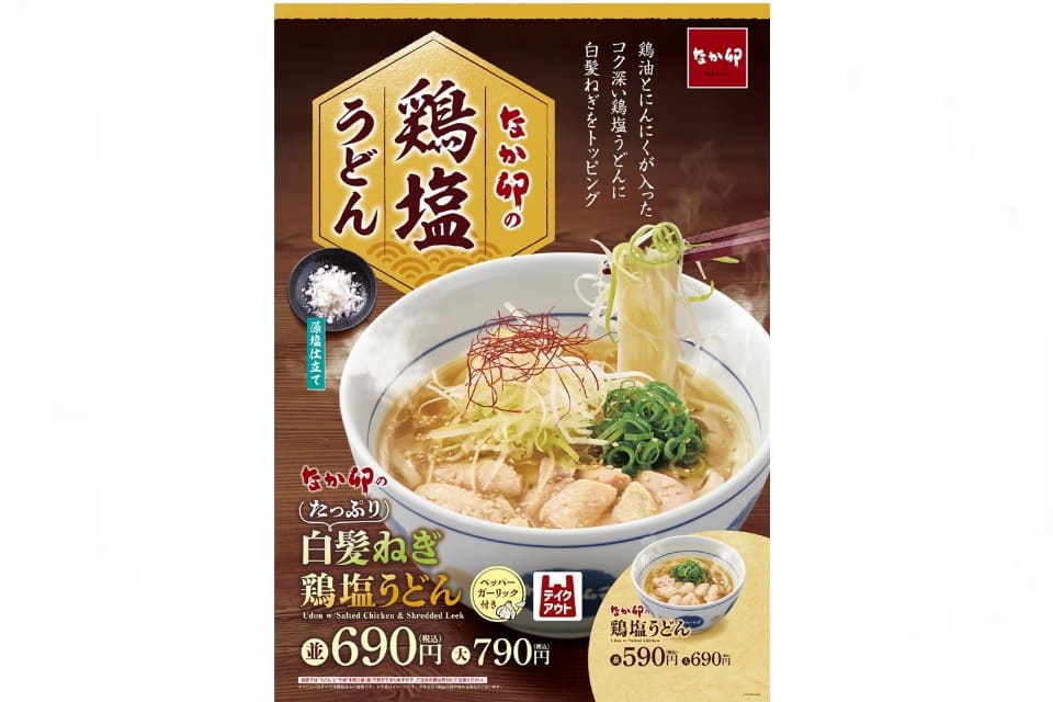 丼ぶりと京風うどんの「なか卯」は、人気メニュー「鶏塩うどん」に白髪ねぎをたっぷりトッピングした「たっぷり白髪ねぎ鶏塩うどん」を2月18日に発売する。