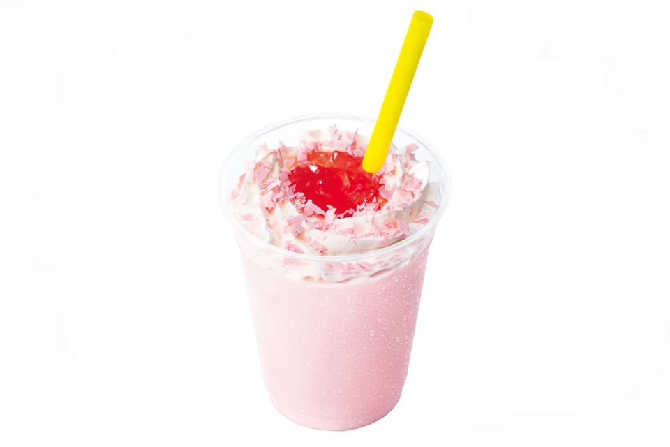 桜風味のシロップを使ったシェーキに、口どけのよいホイップクリーム、味と食感のアクセントになる苺果汁が入ったクラッシュゼリー、薄く削った桜色のチョコをトッピングしたドリンク。ふんわり香る桜の風味で春を満喫できる、パフェのようなドリンクになっている。