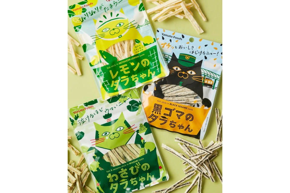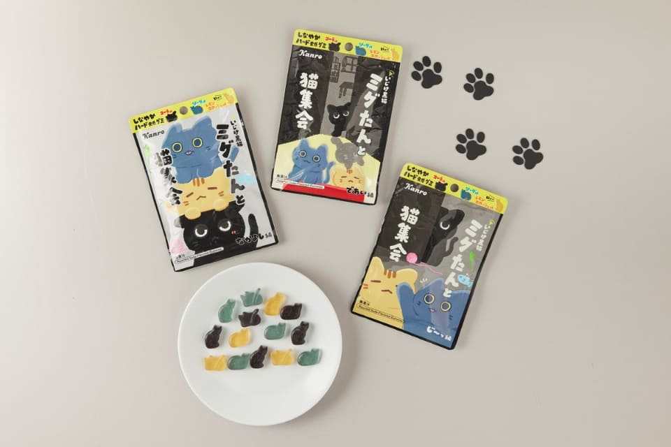 猫のしなやかな動きに着想を得た、しなやかでハードな食感のグミ。黒猫ミグたん(コーラ味)、茶猫ミーたん(レモンスカッシュ味)、ブルーグレー猫グーたん(ソーダ味)の3種類が入っている。