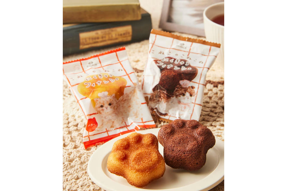 香ばしいアーモンドとバターの香りが広がるしっとりとした食感のフィナンシェで、ねこの肉球型になっている。