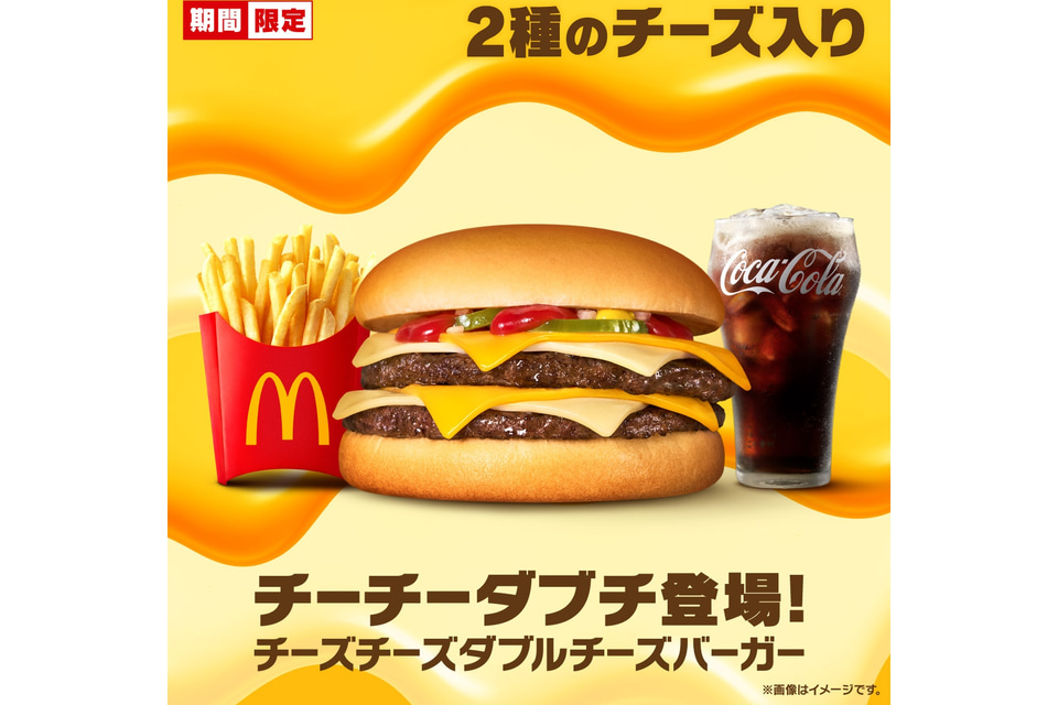 日本マクドナルドは「ダブルチーズバーガー」に、まろやかなホワイトチェダーチーズを2枚加えた「チーズチーズダブルチーズバーガー」(チーチーダブチ)を2月18日から2週間限定で販売する。価格は500円から。