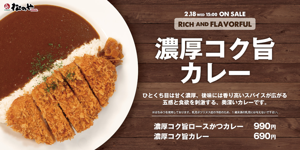 とんかつ専門店「松のや」(松屋フーズ)は「濃厚コク旨カレー」を2月18日15時に発売する。
