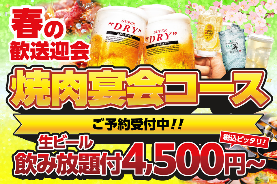 安楽亭、春の歓送迎会に向けお得なプランを用意。「焼肉コース+生ビール飲み放題」は“4500円”から