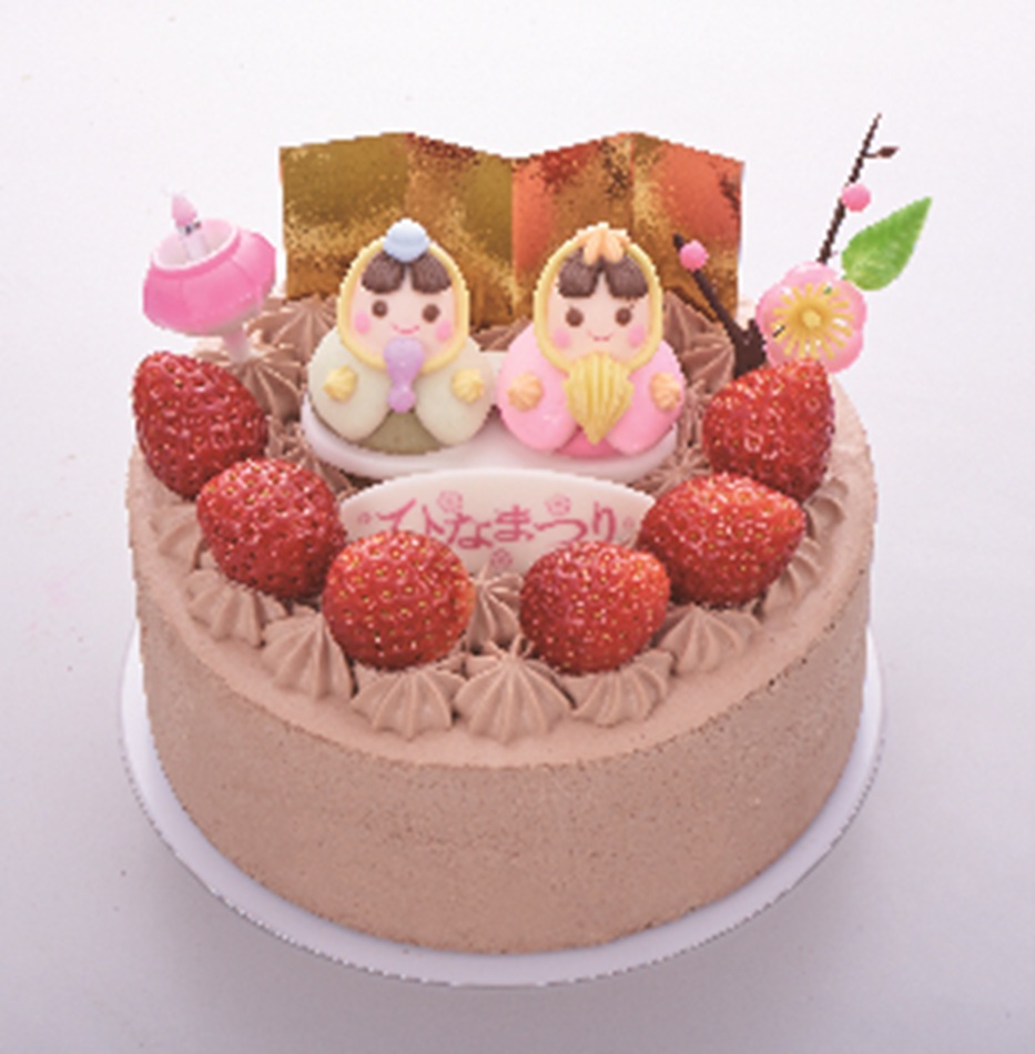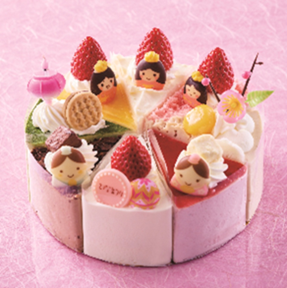 苺みるく、パリパリチョコレート、ホワイトチョコレート、チョコバナナ、抹茶、ミックスベリー、レアチーズ、マロンを1個ずつ詰合せた、多様なフレーバーを楽しめるデコレーションケーキ。ひな壇をイメージし、チョコレートでできたおだいりさま・おひなさま・三人官女を飾りつけた。