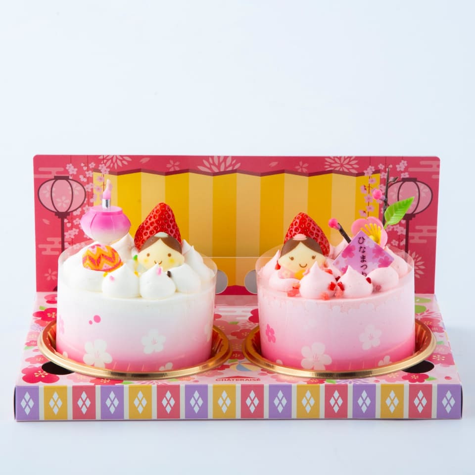 「桃の節句 ちいさなひなケーキ(白)」と「桃の節句 ちいさなひなケーキ(ピンク)」を、ひなまつりデザインの専用箱に1個ずつ詰め合わせた手軽で華やかなケーキセット。
