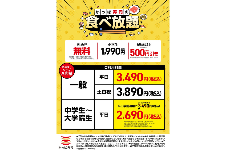 また「平日価格」および「平日割」も同期間で延長する。「平日価格」適用時は、一般3490円、シニア2990円となり、学生は「平日割」と「平日学割」の両方を適用すると2690円で食べ放題となる。