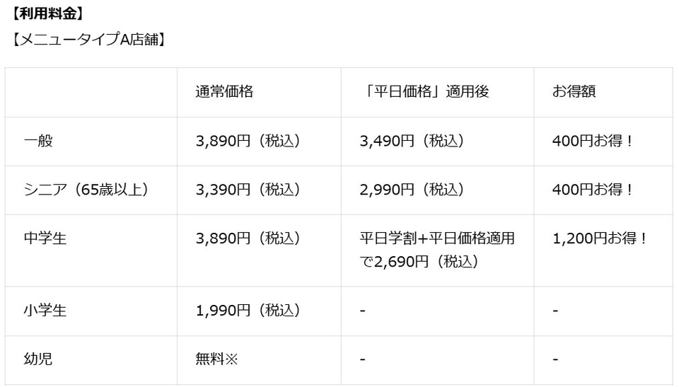 [メニュータイプA店舗]一般3890円、シニア(65歳以上)3390円、小学生1990円、幼児(未就学児)無料※