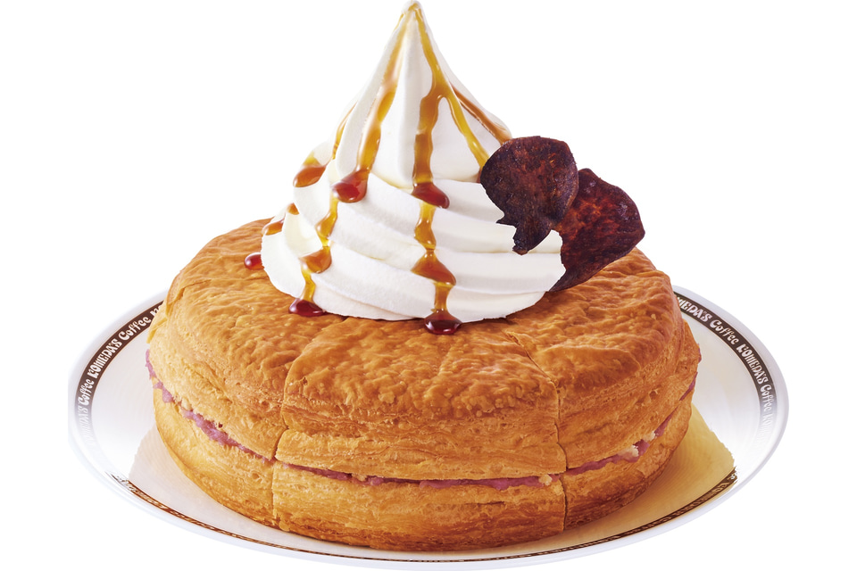 シロノワール まーさん紅いもは、コメダの看板商品のシロノワールをベースにしながら、沖縄らしさを追加。デニッシュには紅いもあんと砕いた塩ちんすこうをサンドし、ソフトクリームの上から黒糖みつをかけ、紅いもチップスがトッピングされている。商品名の「まーさん」は、「おいしい」を意味する沖縄の方言。