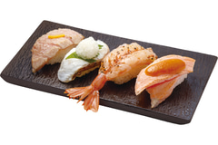 炙り本鮪大とろゆず塩、炙りまだい(大葉おろしのせ)、天然赤えびレアステーキ、サーモン西京炙り(2枚のせ)