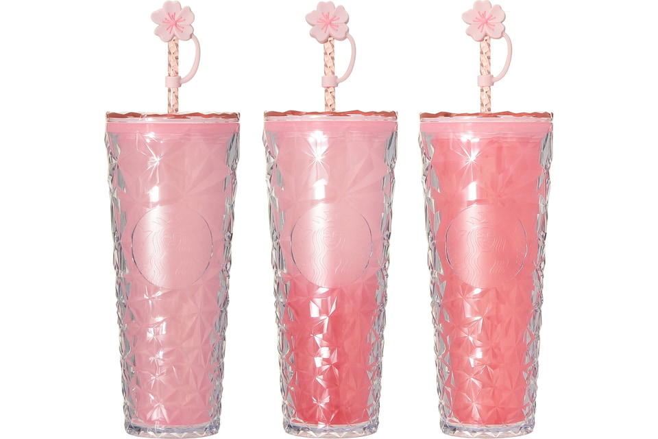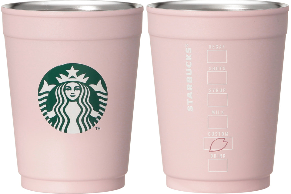 直接ドリンクを注いで使え、テイクアウトカップごと入れることでカップホルダーとしても使える2WAYステンレスカップ。真空二重構造の断熱効果により、フラペチーノや冷たい飲み物がより長い時間楽しめる。桜を思わせる淡いピンクで、背面カスタマイズボックス部分にもさりげなく桜の花びらを描いている。