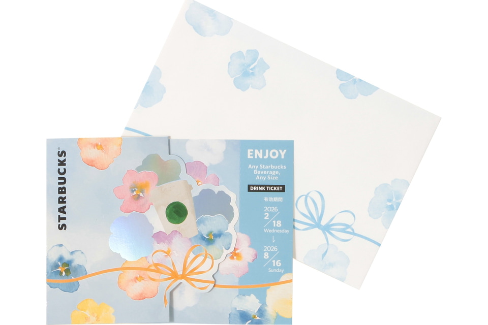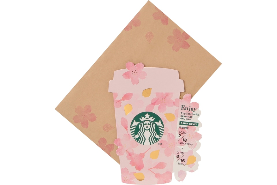 メッセージにドリンクを添えて贈ることができるドリンク引換券付きメッセージカード。人気のカップ型に桜のアートワークを並べたデザインになっている。