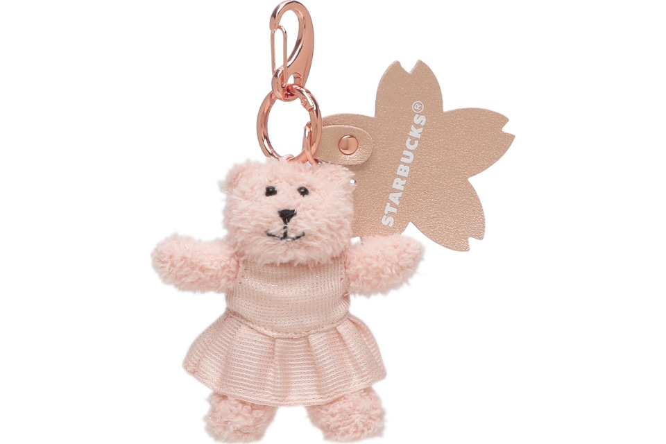 淡い桜カラーのドレスを着た、可愛らしいベアリスタキーチェーン。STARBUCKSロゴを印刷したレザー調の桜型のチャームとピンクゴールドの金具がデザインアクセント。