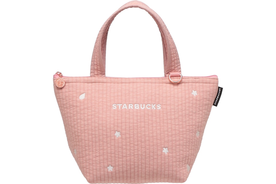桜を刺繍で表現した保冷トートバッグ。ナチュラルな風合いの本体素材に細かな縦のキルティングを施したトレンド感あるデザインで、STARBUCKSロゴと桜の花びらを刺繍で表現。サイレンロゴを型押ししたファスナー引手と、チャームを取り付ける金具部分はピンクゴールドで仕上げている。