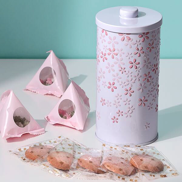 桜の花びらをエンボス加工でデザインしたミニ缶(75×75×20mm)とキャニスター缶(75×150mm)で、それぞれピンクとホワイトを用意している。ミニ缶にはさくらんぼ風味のキャンディが入って価格は399円、キャニスター缶にはストロベリー風味クッキーとこんぺいとうが入って価格は734円。お菓子を食べ終わったあとは小物入れに利用できる。