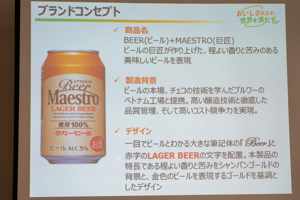 続いて、商品説明で登壇したのは食品流通部 酒類グループ長の川上洋平氏。「Beer Maestro(ビアマエストロ)」は、『毎日の食卓に妥協のない本物を』を開発コンセプトに、本物のビールの味わいを手頃な価格で提供するというポジションを狙って世界有数のビール消費国・ベトナムで製造する。