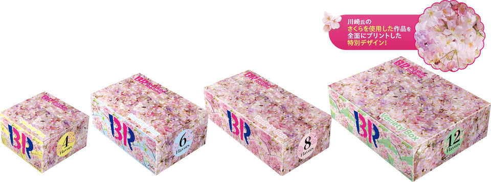 フラワーアーティスト川崎景太氏とのコラボデザインで登場。川崎氏の「さくら」を題材にしたアート作品がバラエティボックスになった。天面も側面もさくら尽くしの華やかなボックスで、手土産やイベントごとにもおすすめ。