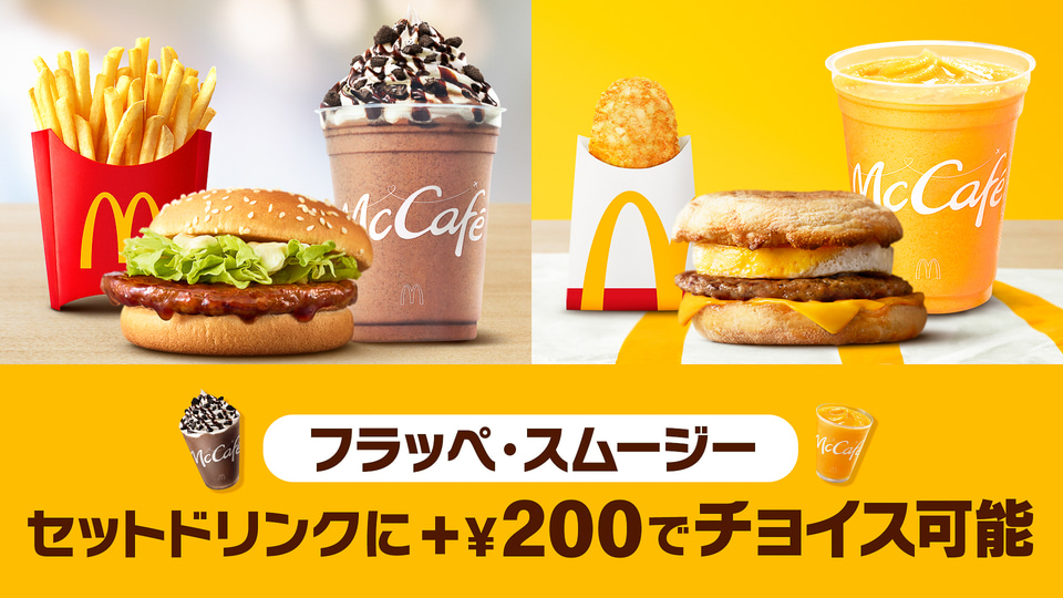 日本マクドナルドはお得なセットメニュー「バリューセット」のセットドリンクに、McCaféのフラッペとスムージーを2月25日から追加することを発表した。