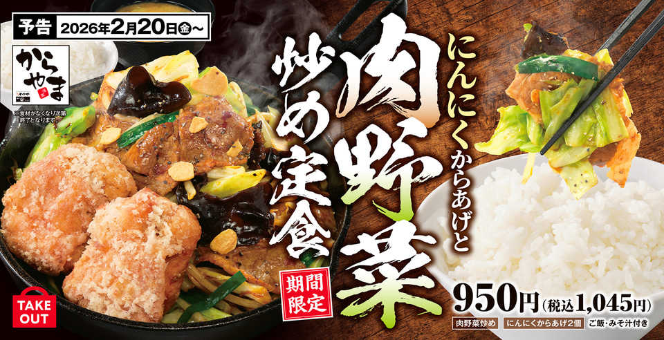 からあげ定食専門店「からやま」(エバーアクション)は、「にんにくからあげと肉野菜炒め定食」を期間限定で2月20日から販売する(なくなり次第終了)。