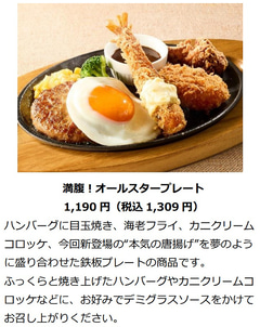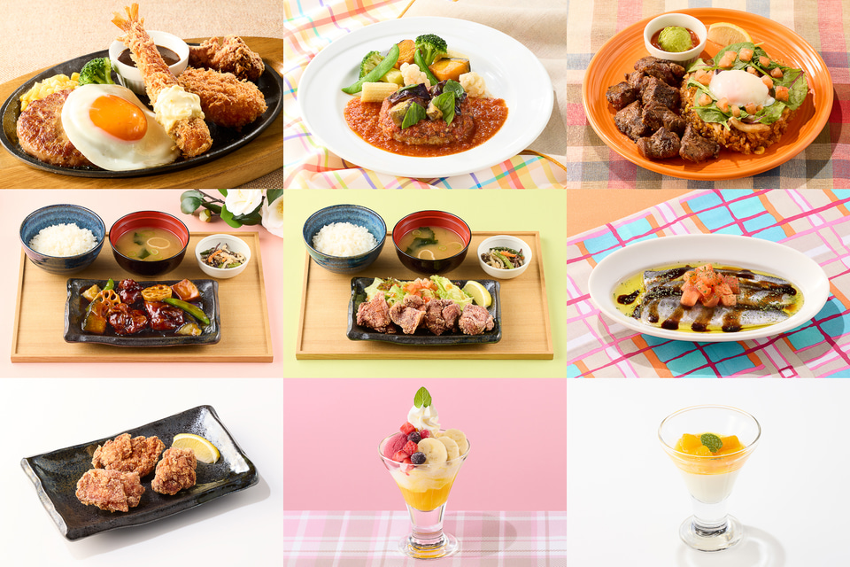 ハンバーグをガッツリと味わえる「満腹!オールスタープレート」や「揚げなすとバジルのガーリックトマトハンバーグ」、スパイシーな風味が食欲をそそる「カリブビーフジャンバラヤ」、特製たれにこだわった「本気の唐揚げ」などの新メニューを導入するほか、ミニサイズのデザートメニューのバリエーションを拡充する。