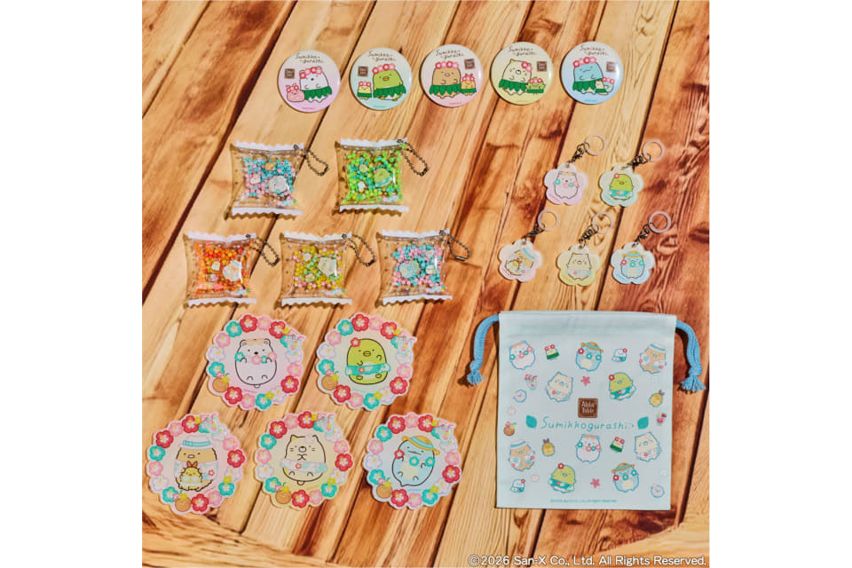 テイクアウトメニューのスムージージェラートはキャラクターごとに全5種のフレーバーがあり、5種セットを購入するとすみっコたちが集合したステッカーをプレゼント。そのほか、リゾート風衣装のすみっコたちがデザインされた缶バッチや巾着などのグッズを全店舗で販売する。