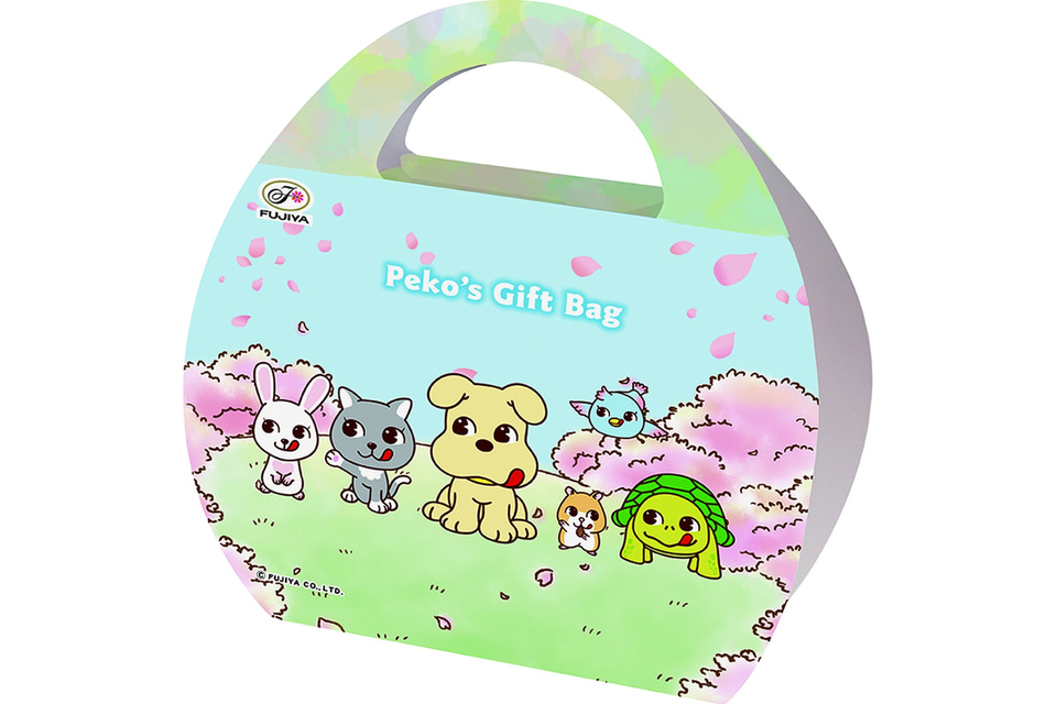 持ち手付きのボックスに、不二家のお菓子を詰め合わせた。表面にはペコちゃん・ポコちゃんが、裏面にはドッグをはじめとする「ペコちゃんポコちゃんとゆかいな仲間たち」のキャラクターが描かれている。名前を書いて貼れる名前シール1枚(4カット)入り。