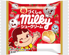 ひとつで苺クリームとミルキークリームの2種類の味わいが楽しめるシュークリーム。パッケージは全4種類で、洋菓子商品では新キャラクターが初登場。楽しいイラストとともに、甘酸っぱい苺とまろやかなミルキーのハーモニーが楽しめる。