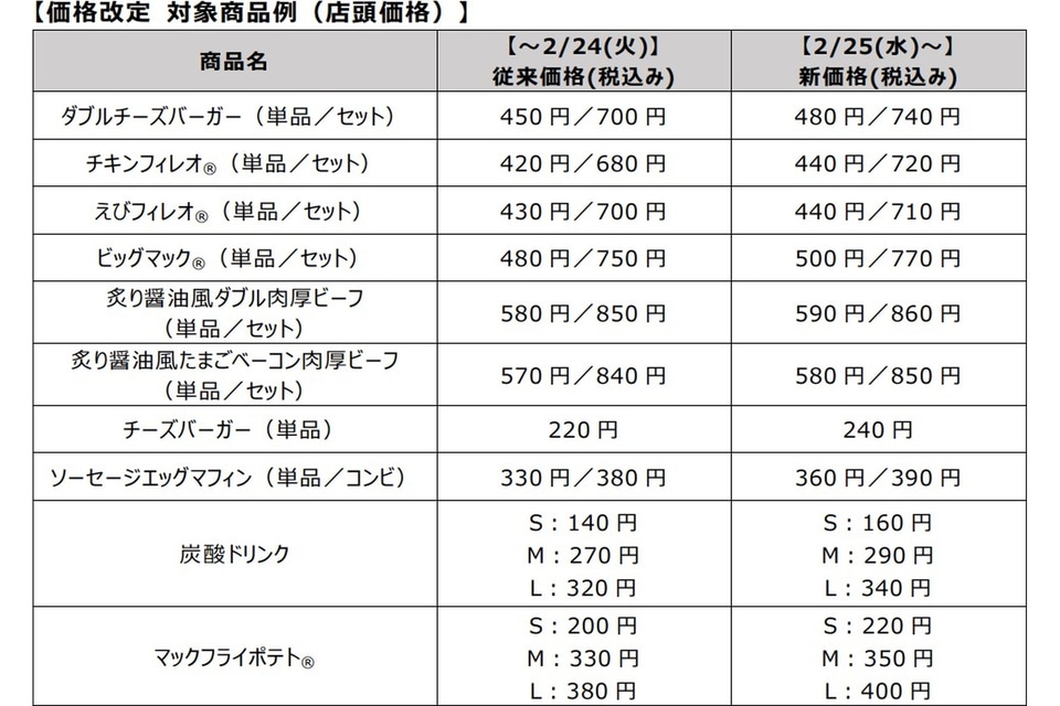 マクドナルド、2月25日に価格改定。店頭価格を10~50円値上げ、一部商品をリニューアル