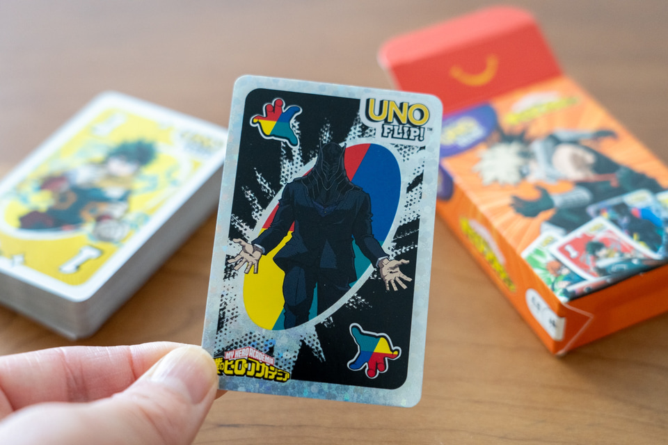 それでは第1弾から紹介しよう。「UNO フリップ SPY×FAMILY アーニャ」「UNO SPY×FAMILY ロイド」「UNO オールワイルド 僕のヒーローアカデミア 轟焦凍(とどろきしょうと)」の3種。写真では分かりづらいが、それぞれ1枚ずつ入っているホログラムの特殊カードは光の反射でキラキラして高級感がある。