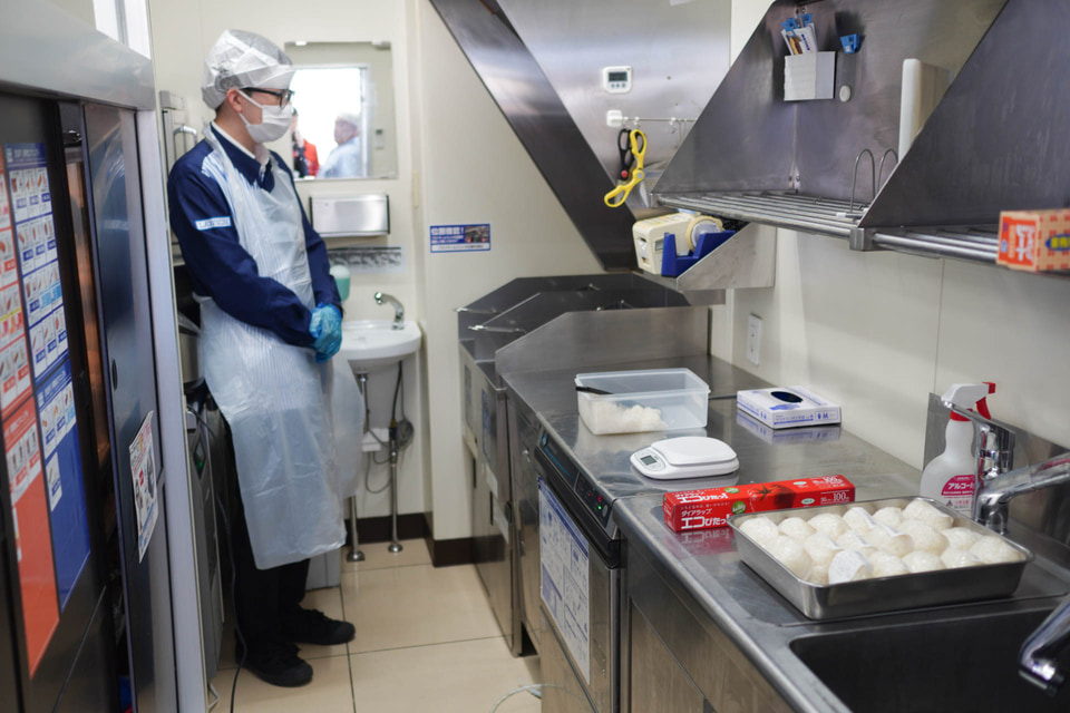 炊飯に使う白米は、特別に備蓄するものではなく、通常時提供しているのと同じ在庫を使用する。なお、こちらは見た目はおにぎりだが、「店炊きごはん」という扱いで、食塩や海苔は入っていない。