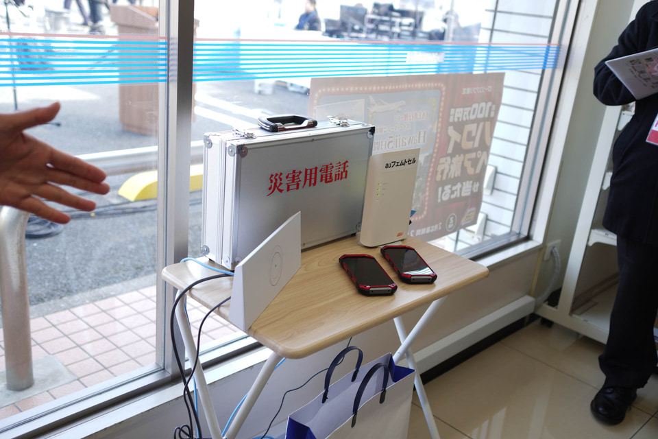 さらに周囲の携帯電話基地局が使えなくなるような災害が発生した場合、超小型の簡易基地局(フェムトセル)が店内に設置される。au回線のスマートフォンは、このフェムトセル周辺では通信が可能となり、緊急通報を含む音声発信や緊急地震速報も受け取れる。このフェムトセルのネットワーク回線としても前述のStarlinkが使われる。