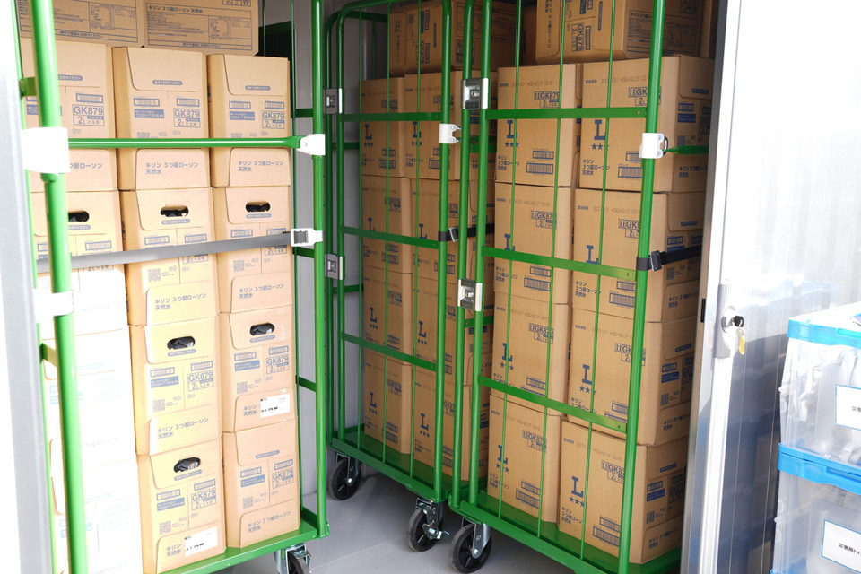この飲用水のストックは、物流で使われるいわゆる「カゴ台車」に積まれており、保管庫内でカゴ台車を反時計回りに移動させていけば常に古いストックが手前にきて取り出しやすくなる、といった工夫がなされている。
