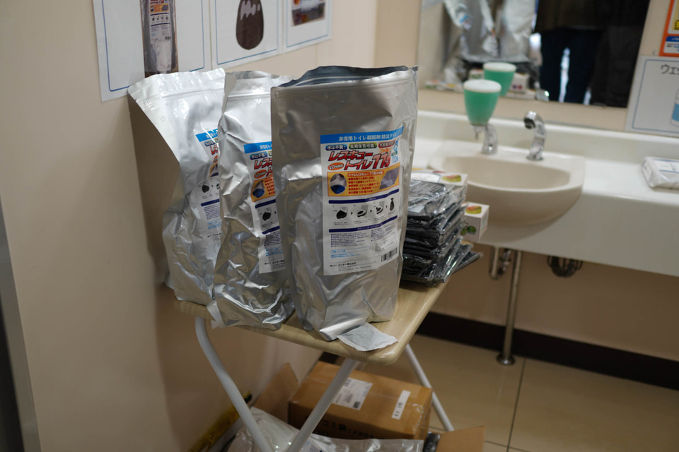 災害用トイレもストックされている。排泄物を入れるポリ袋と凝固剤がセットになった一般的なもので、数百セットが備蓄されている。前述の通り、ローソン富津湊店は井戸と浄化槽を備えているので、大きな災害でも通常通りトイレを使用できる可能性が高いのだが、なんらかの理由で揚水ポンプが使えなくなったり、利用者が多すぎて容量を超えてしまったりするケースも想定されるので、そうした備えという意味でも災害用トイレが用意されている。