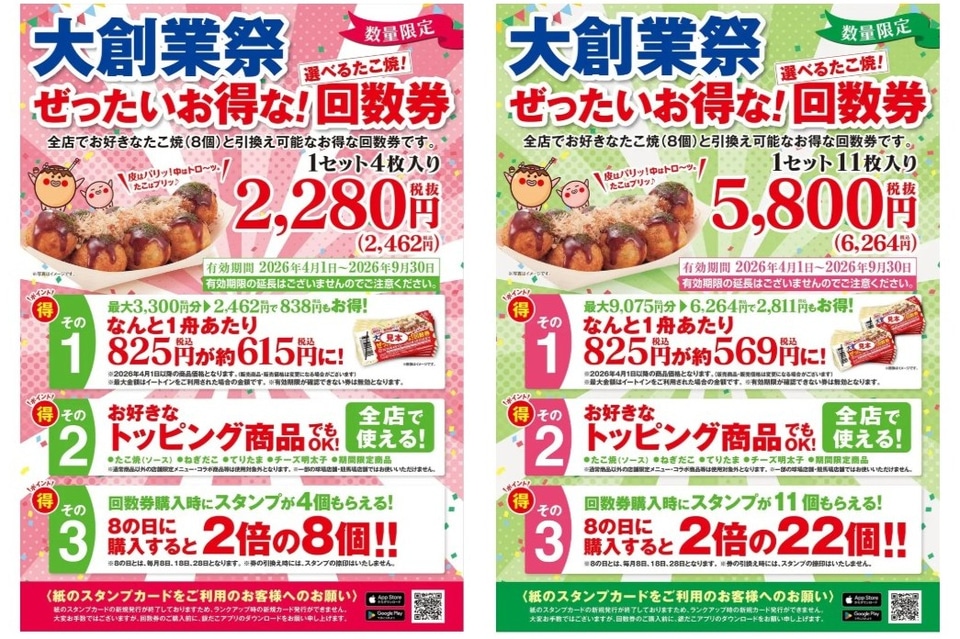 「ぜったいお得な!回数券」は、好きなたこ焼(1舟8個入り)と引換え可能で4枚セット2462円と、11枚セット6264円の2種を販売する。購入時には、スタンプが貯まるとたこ焼が無料でもらえる「銀だこスタンプカード」のスタンプを、回数券の枚数分プレゼントする。なお「大創業祭」開催中のため、3月7日はスタンプ2倍、3月8日と3月14日はスタンプ3倍となる。