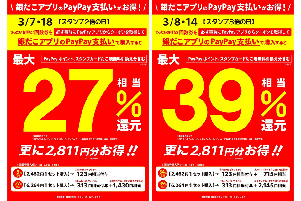 築地銀だこ(ホットランド)は、「ぜったいお得な!回数券」を3月7日に発売する。また、PayPayで2462円以上支払うと会計金額最大5%のPayPayポイントが戻ってくる「PayPayクーポン」も3月7日~20日に配布する。
