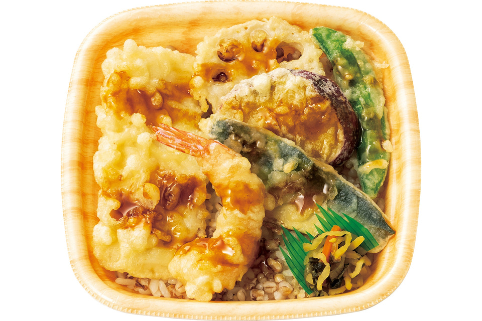 また、エビの天ぷらを5尾盛り付けたボリューム満点の「上・海鮮天丼」や、天ぷらを甘めの醤油だれで煮込み、玉子でふんわりととじた「海鮮天とじ丼」、もち麦ごはんを使用した「もちミニ 海鮮天丼」、セパレートタイプの「海鮮天ぷら弁当」もラインアップする。